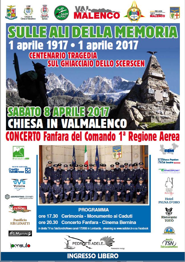 Nell'ambito delle manifestazioni per il centenario della tragedia accaduta allo Scerscen l'1 e il 2 aprile 1917, sabato 8 aprile 2017 avrà luogo la commemorazione dell'evento presso il Monumento ai Caduti di Chiesa in Valmalenco alle ore 17.00.