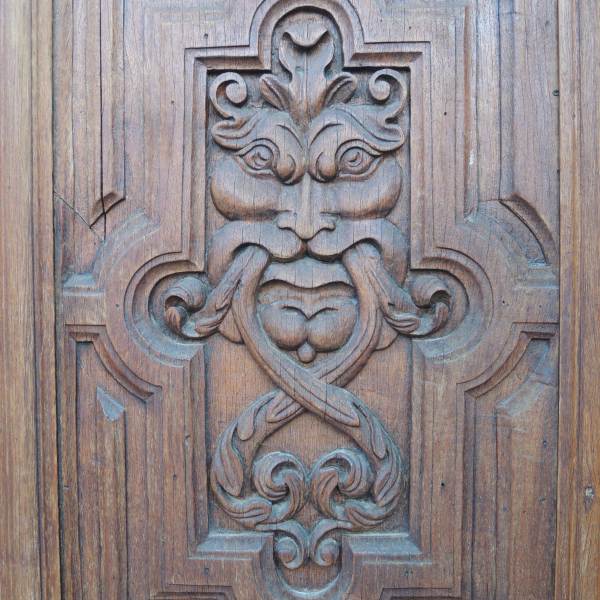 Sono rimasti invece i vecchi battenti in legno, intagliato (secoli XVII/XVIII).
