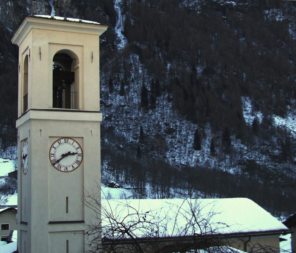 Il campanile della chiesa di S. Pietro sorge a sinistra e risale ai primi decenni del XVII secolo come la chiesa a cui è collegato. La torre è a pianta quadrata. In alto l’orologio a numeri romani, che si ripete identico sui quattro fronti. Fu fatto fare nel 1796 dall’orologiaio Antonio Picen di Edolo in Val Camonica. L’ultimo campo è costituito dalla cella campanaria. La copertura è a quattro falde coronata da una croce metallica. L’interno è percorribile mediante scale a pioli in legno, fino alla cella campanaria in cui è posta l’unica campana bronzea, azionata elettricamente. Quando nel 1752 si ruppe la campana originaria, si decise di venderla e di farne fondere una nuova che fu commissionata al mastro campanario Carlo Giuseppe Quadrio di Chiuro e pagata 640 Lire. Nel 1936 venne definitivamente rifusa.