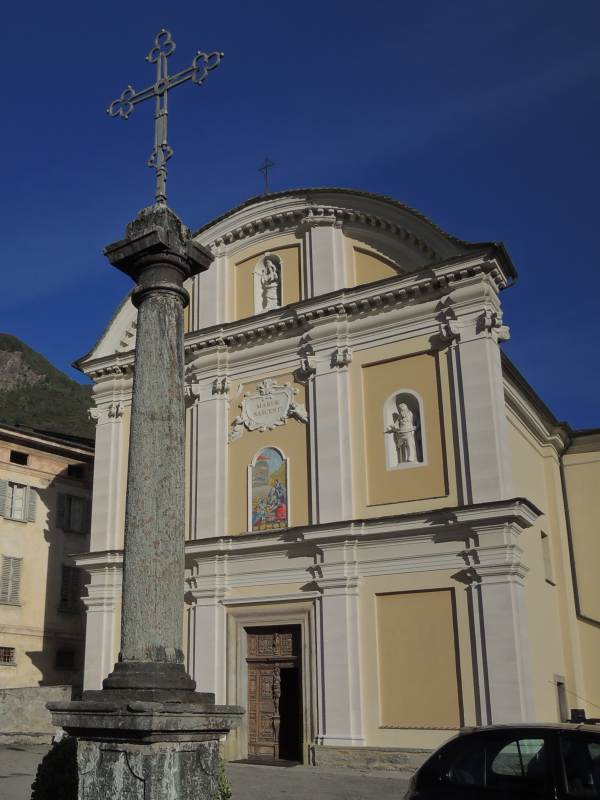 La chiesa, quasi del tutto ricostruita nel 1620 e allungata nel 1919, sorge su un vasto terrapieno e ha davanti un bel piazzale in posizione dominante sulla vallata.
