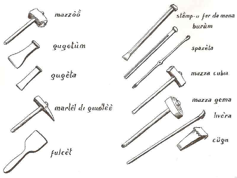 Presso l’imbocco della galleria una modesta tettoia (teciäda) fungeva da laboratorio e qui, con affilati scalpelli, pazientemente e con colpi precisi di martello, i lotti si scindevano in lastre, chiamate “i ciödi” (piode).