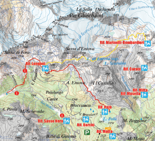 Dal rifugio si raggiunge la soprastante ampia cresta sud ovest della Sassa d'Entova, che si segue sino a circa 2750m, dove abbassandosi leggermente si attraversa l'ampio vallone dell'Entovasco sino al Pian dei Buoi per proseguire verso l'evidente Forcella d'Entova.