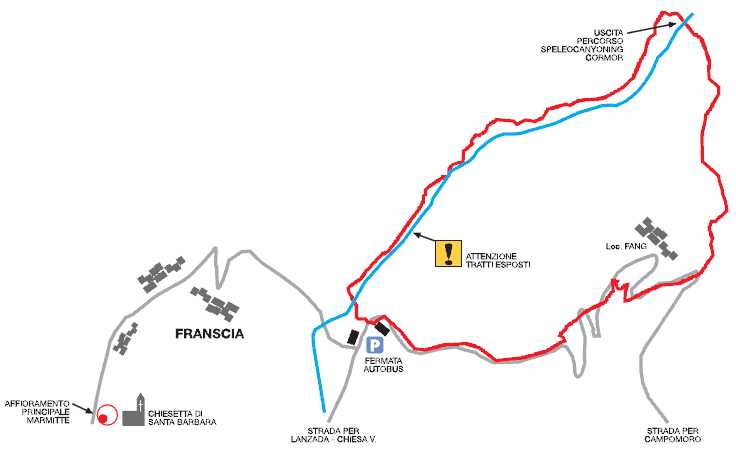 La risalita per sponda sinistra avviene tra sorgenti, tappeti di muschio e una singolare zona umida nei pressi della località Fang, dove in breve ci si ricollega all'abitato di Franscia.