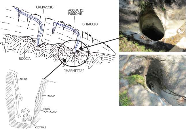 Si tratta di forme di ogni forgia e dimensione tra cui alcune "marmitte dei giganti" ossia erosioni perfettamente cilindriche create dal mulinare vorticoso dei detriti con l'acqua di fusione dei ghiacciai.