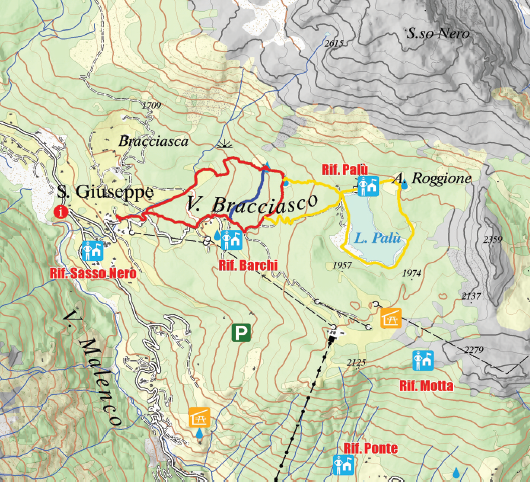 La variante lunga è viceversa indicata con il colore giallo e si sviluppa intorno al Lago Palù.