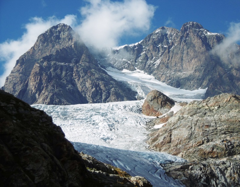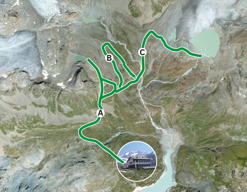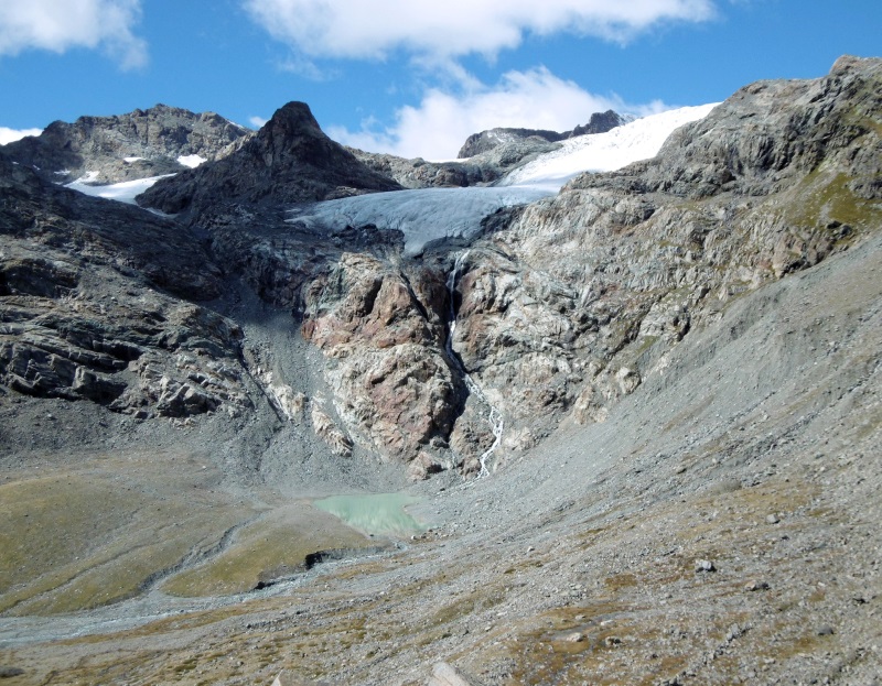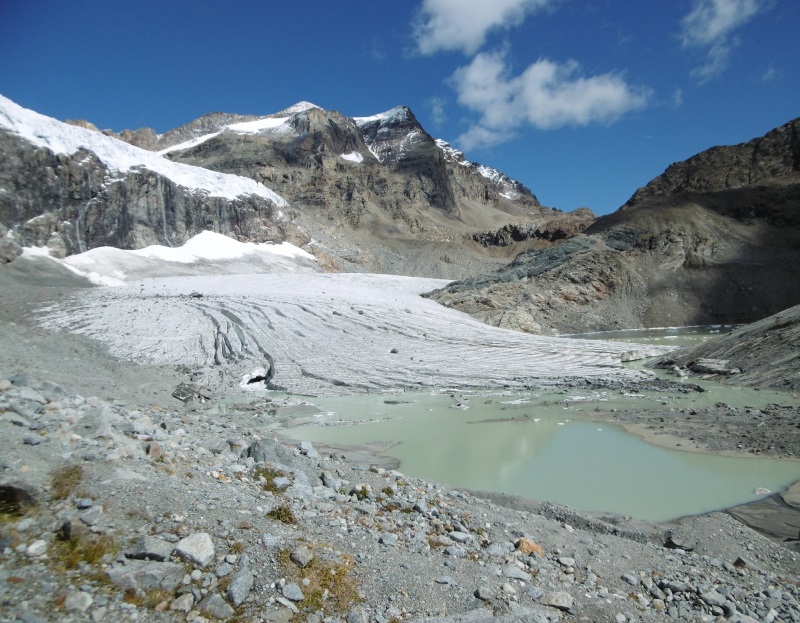 Percorso panoramico sul filo di cresta della morena laterale del ghiacciaio Fellaria Ovest, fino ad arrivare ad un lago di sbarramento morenico in vicinanza alla fronte glaciale